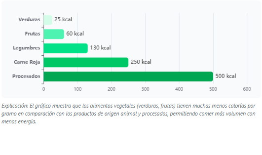 Menos Calorías por Gramo. Los alimentos vegetales tienen una baja densidad calórica (aprox. 50 kcal/100g) en comparación con los de origen animal (200 kcal/100g). Esto permite comer porciones más grandes y saciantes, facilitando el control del déficit calórico necesario para perder peso.