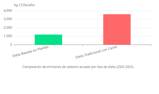 • Reducción de la Huella de Carbono:La dieta plant-based reduce drásticamente las emisiones de gases de efecto invernadero. Mientras una dieta tradicional genera unos 3600 kg de CO2e/año, una vegetal solo produce 1200 kg, lo que demuestra su potencial para mitigar el cambio climático.