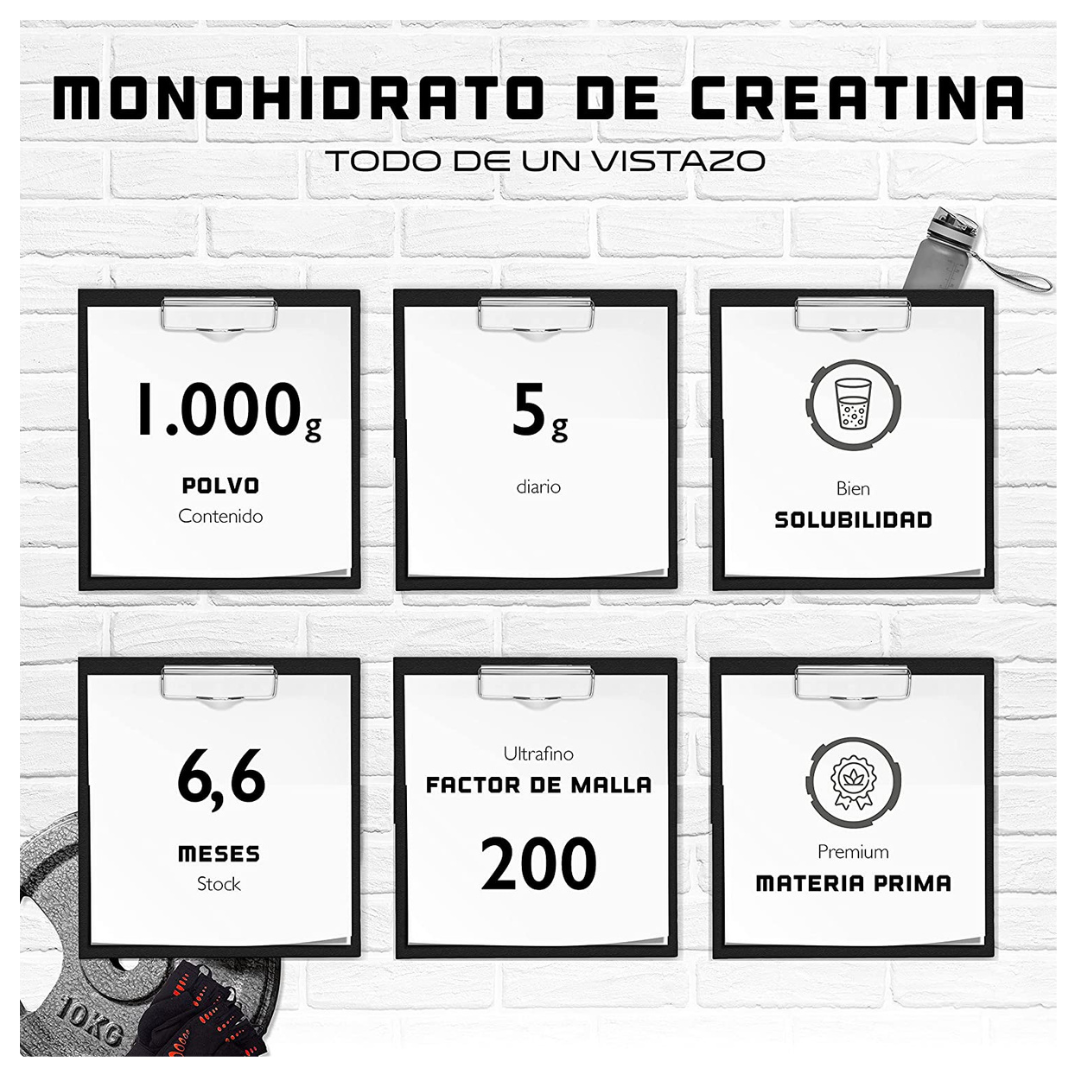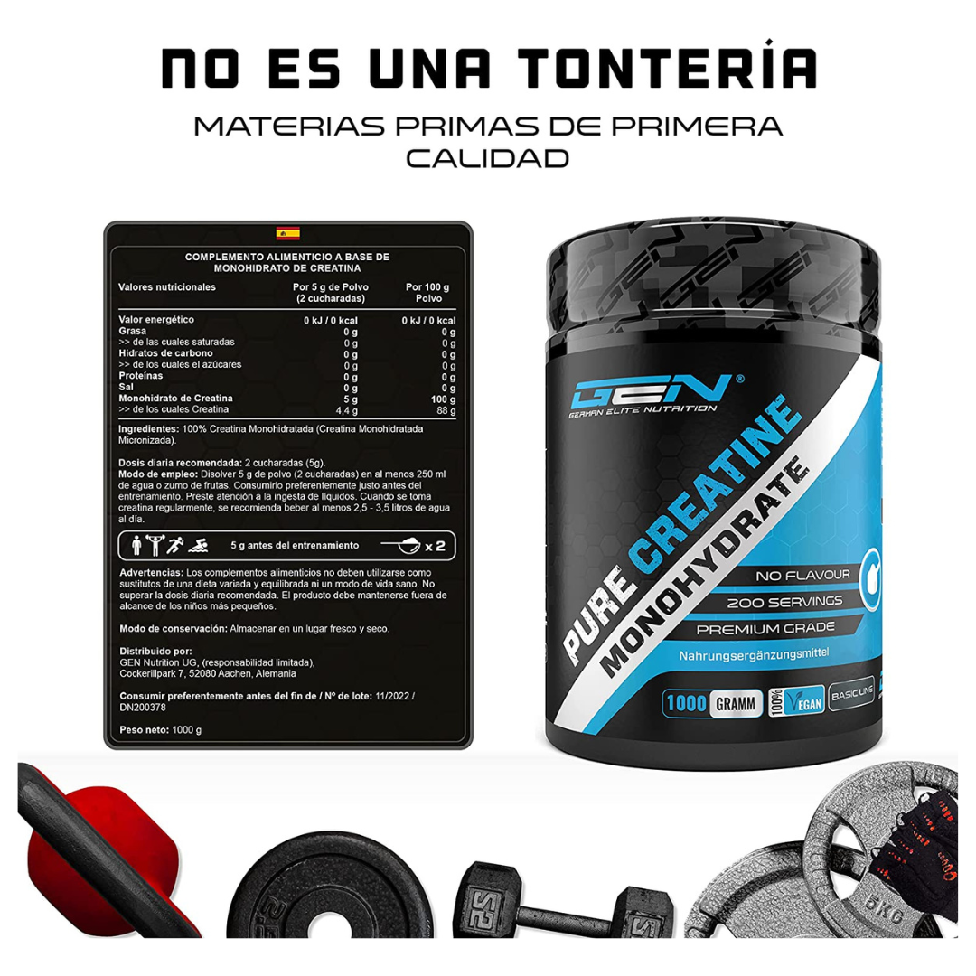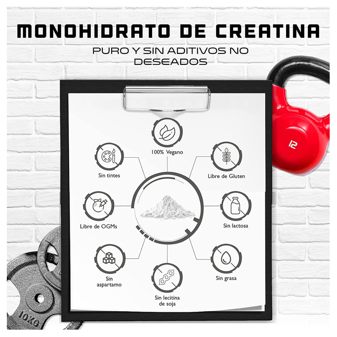 - Cada lata de Monohidrato de creatina puro 1000 g., contiene polvo de monohidrato de creatina puro.