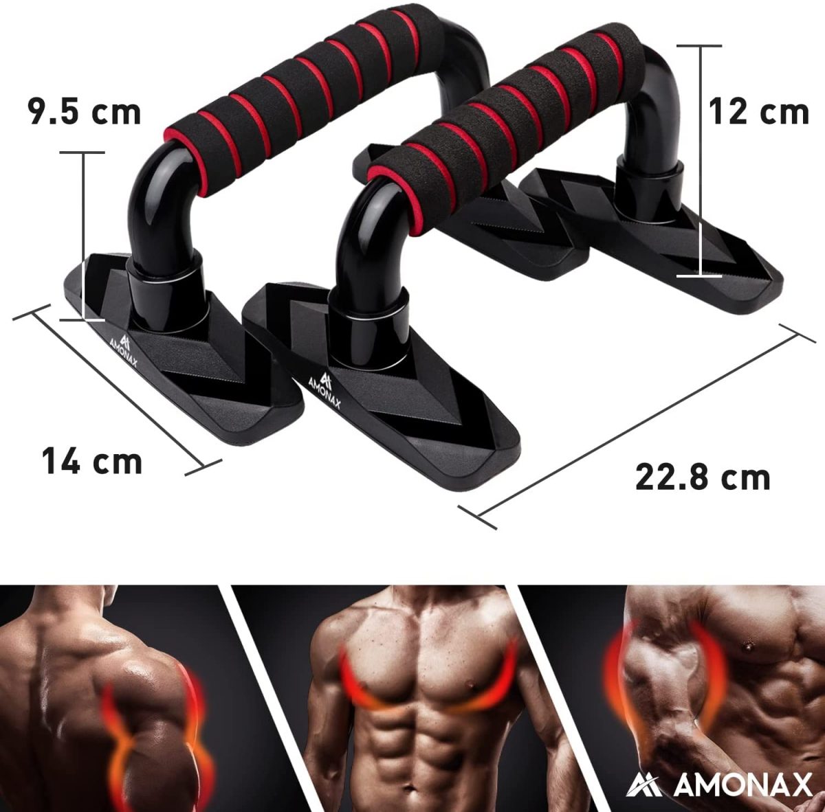 Las barras de push up están hechas de marcos de acero y espumas viscoelásticas antideslizantes y resistentes al desgaste. Las barras soportes para flexiones de Amonax están inclinadas en un ángulo de 15 grados para una protección máxima de la muñeca y una eficiencia del entrenamiento. Los soportes para lagartijas de Amonax son excelentes entrenadores de brazos y hombros, lo que los convierte en un equipo de kit ejercicio en casa esencial para ser incluido.