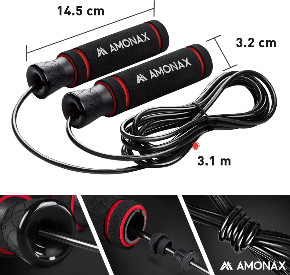 La cuerda para saltar que quema calorías de Amonax utiliza la tecnología patentada de embudo y el sistema de rodamiento de bolas para garantizar una rotación suave de la cuerda. La adición de la cuerda para saltar en este juego de rodillos aparato abdominales lo convierte en un excelente equipo de entrenamiento en casa (también adecuado para el boxeo).